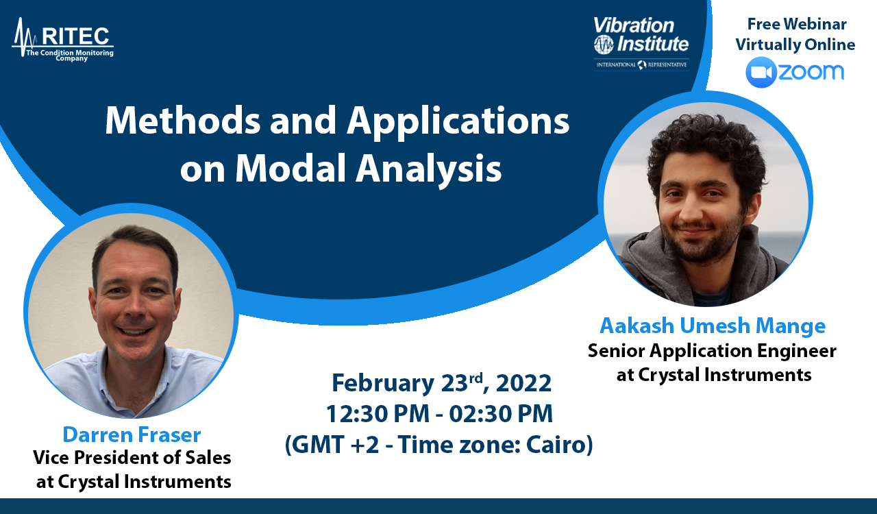 RITEC The Condition Monitoring Company announces the free webinar "Methods and Applications on Modal Analysis", was presented by Darren Fraser and Aakash Umesh Mange - from Crystal Instruments Company, virtually online on Wednesday 23-02-2022, from 12:30 PM to 02:30 PM (GMT +2 - Time Zone: Cairo)